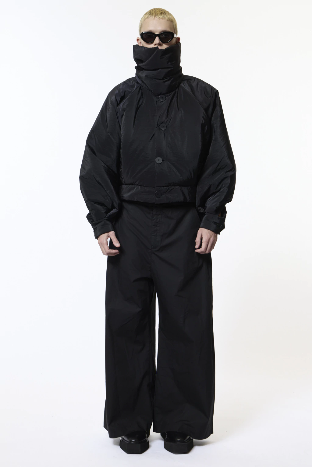 Silueta de largo primer cadera con volumen construido a través de pliegues en delantero y espalda que amplían la estructura; manga ranglan que suaviza la línea de hombro y permite mayor movilidad.